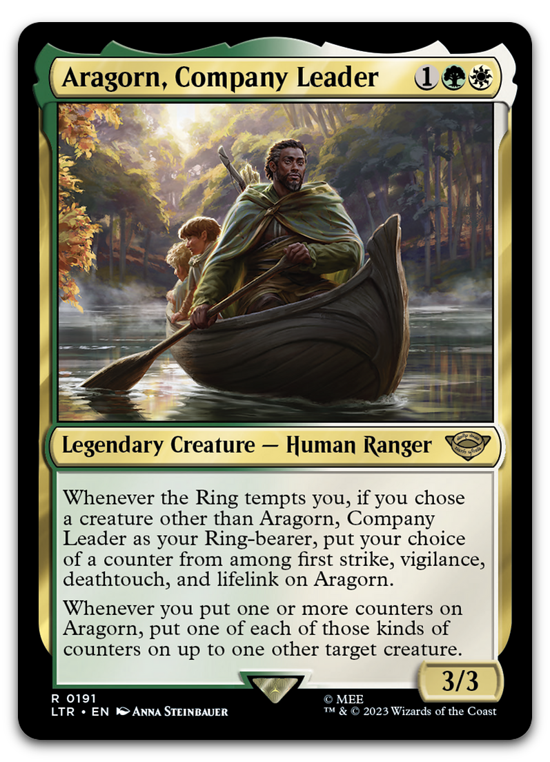 | Card Text | Whenever the Ring tempts you, if you chose a creature other than Aragorn as your Ring-bearer, put your choice of a counter from among first strike, vigilance, deathtouch, and lifelink on Aragorn. Whenever you put one or more counters on Aragorn, put one of each of those kinds of counters on up to one other target creature. |