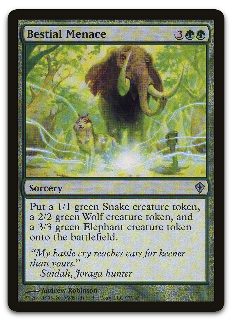 | Card Text | Create a 1/1 green Snake creature token, a 2/2 green Wolf creature token, and a 3/3 green Elephant creature token. |