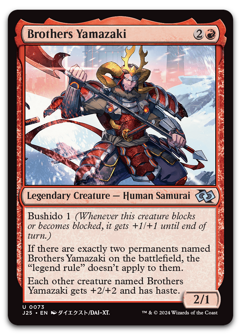 | Card Text | Bushido 1 (Whenever this creature blocks or becomes blocked, it gets +1/+1 until end of turn.) If there are exactly two permanents named Brothers Yamazaki on the battlefield, the "legend rule" doesn't apply to them. Each other creature named Brothers Yamazaki gets +2/+2 and has haste. |