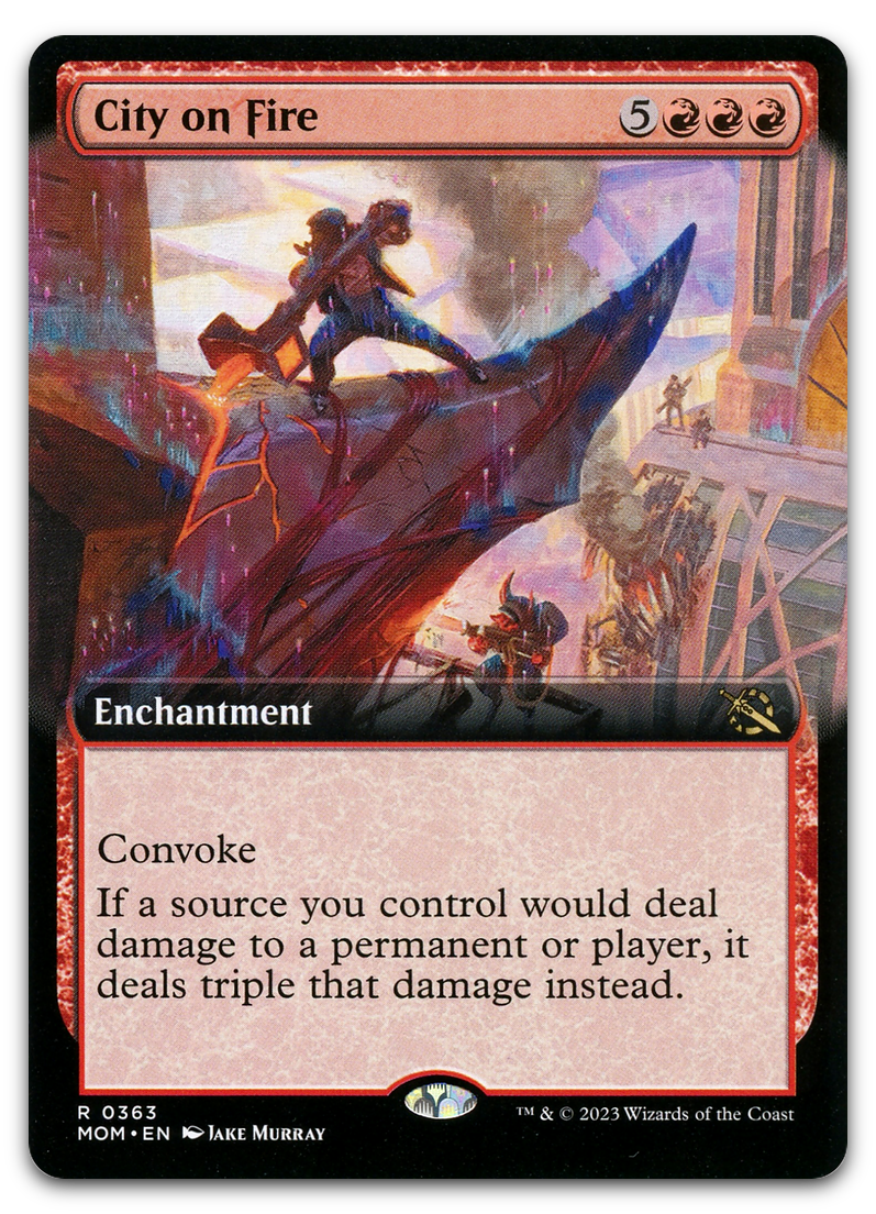 | Card Text | Convoke (Your creatures can help cast this spell. Each creature you tap while casting this spell pays for {1} or one mana of that creature's color.) If a source you control would deal damage to a permanent or player, it deals triple that damage instead. |