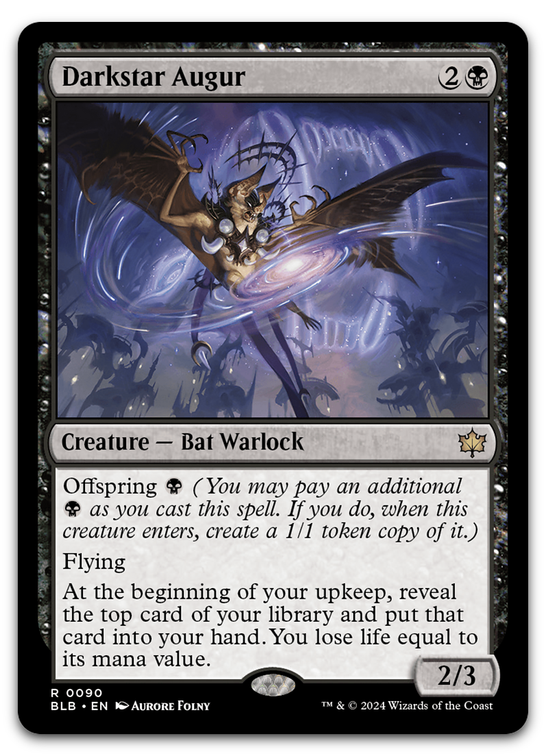| Card Text | Offspring {B} (You may pay an additional {B} as you cast this spell. If you do, when this creature enters, create a 1/1 token copy of it.) Flying At the beginning of your upkeep, reveal the top card of your library and put that card into your hand. You lose life equal to its mana value. |