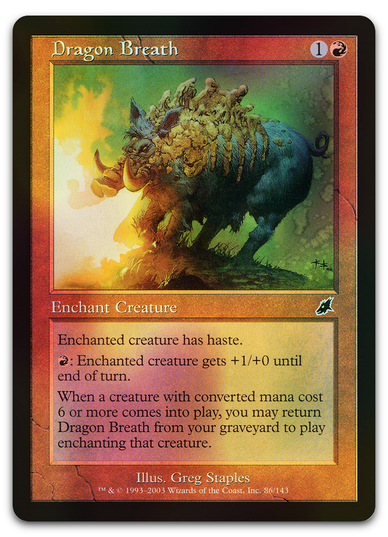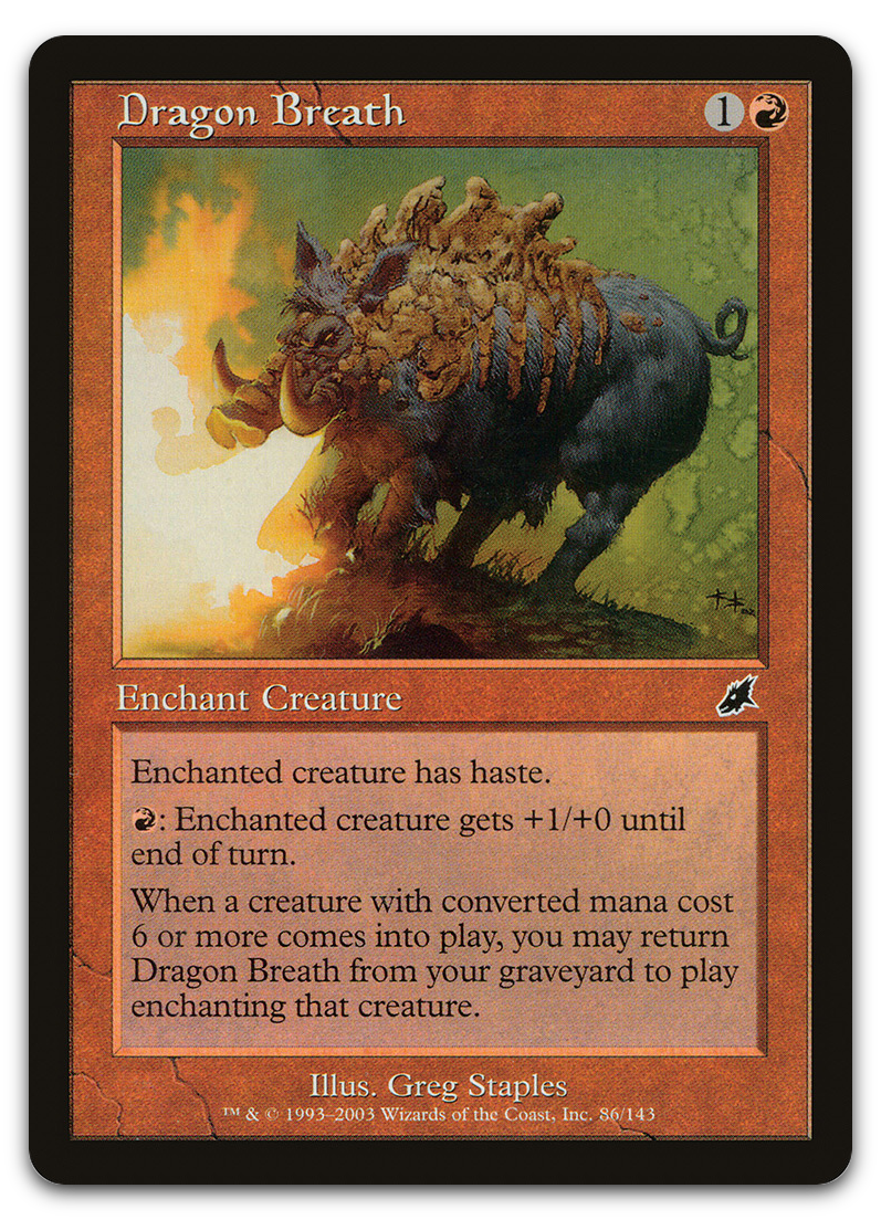 | Card Text | Enchant creature Enchanted creature has haste. {R}: Enchanted creature gets +1/+0 until end of turn. When a creature with mana value 6 or greater enters, you may return this card from your graveyard to the battlefield attached to that creature. |
