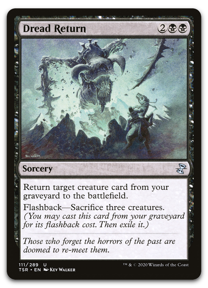 | Card Text | Return target creature card from your graveyard to the battlefield. Flashback—Sacrifice three creatures. (You may cast this card from your graveyard for its flashback cost. Then exile it.) |
