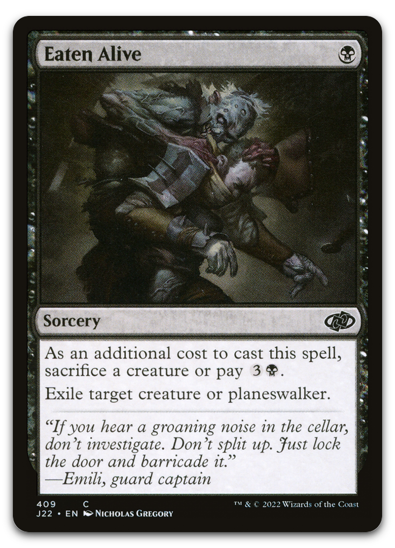 | Card Text | As an additional cost to cast this spell, sacrifice a creature or pay {3}{B}. Exile target creature or planeswalker. |