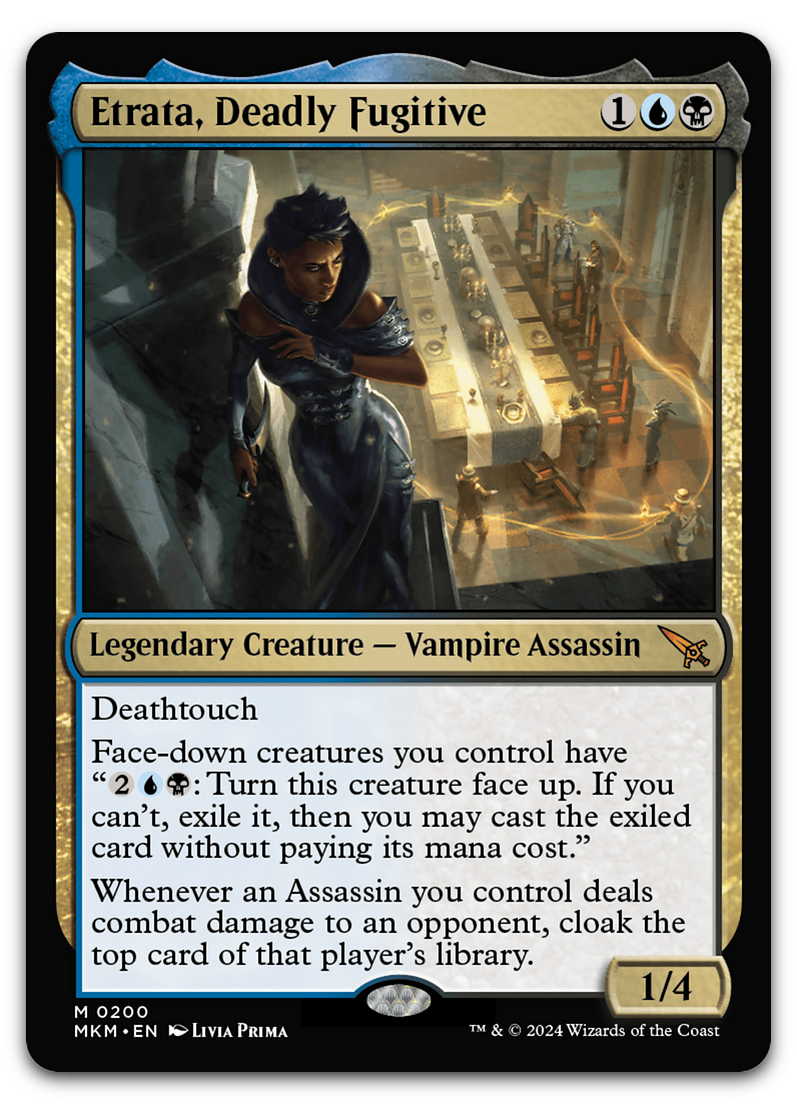 | Card Text | Deathtouch Face-down creatures you control have "{2}{U}{B}: Turn this creature face up. If you can't, exile it, then you may cast the exiled card without paying its mana cost." Whenever an Assassin you control deals combat damage to an opponent, cloak the top card of that player's library. |