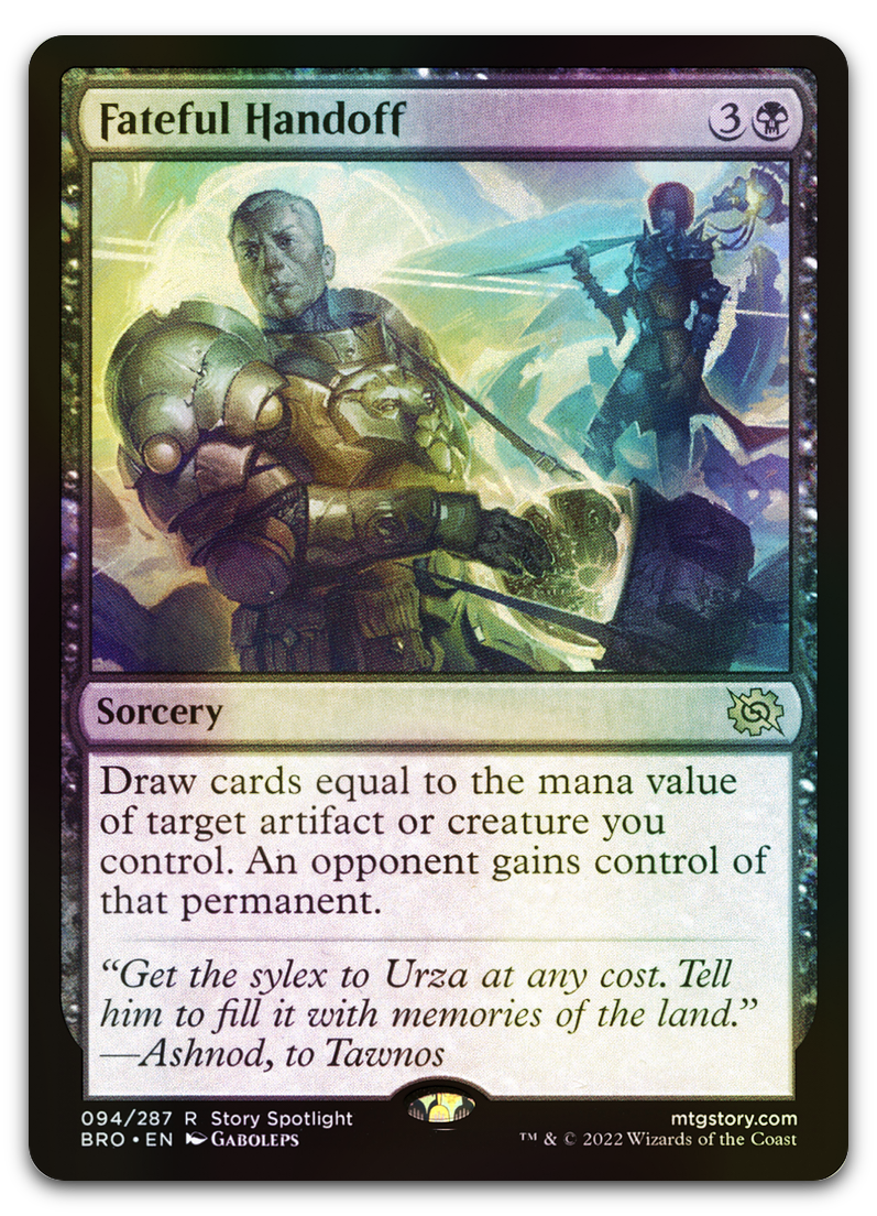 | Card Text | Draw cards equal to the mana value of target artifact or creature you control. An opponent gains control of that permanent. |