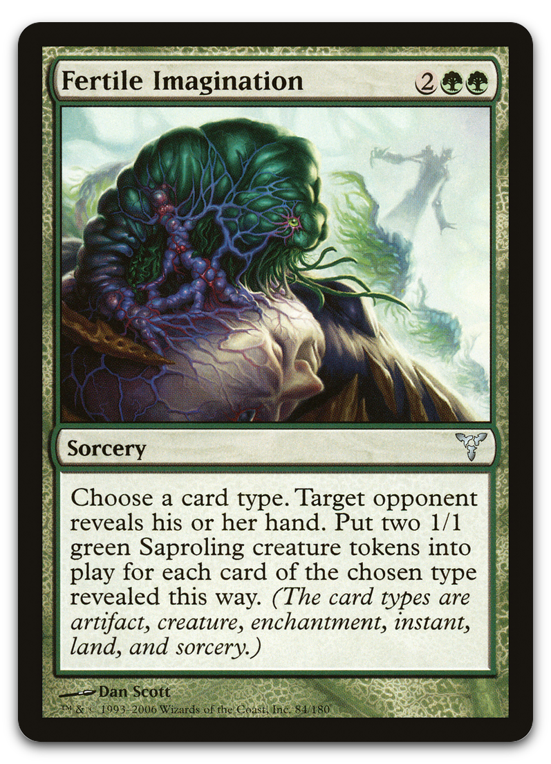 | Card Text | Choose a card type. Target opponent reveals their hand. Create two 1/1 green Saproling creature tokens for each card of the chosen type revealed this way. (Artifact, battle, creature, enchantment, instant, kindred, land, planeswalker, and sorcery are card types.) |