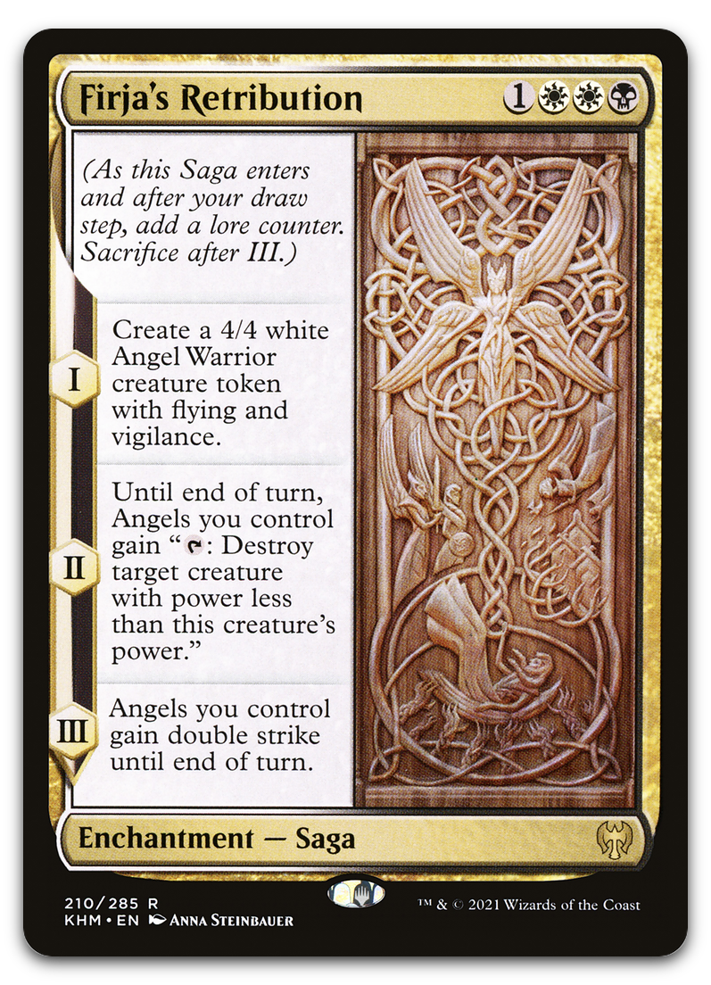 | Card Text | (As this Saga enters and after your draw step, add a lore counter. Sacrifice after III.) I — Create a 4/4 white Angel Warrior creature token with flying and vigilance. II — Until end of turn, Angels you control gain "{T}: Destroy target creature with power less than this creature's power." III — Angels you control gain double strike until end of turn. |