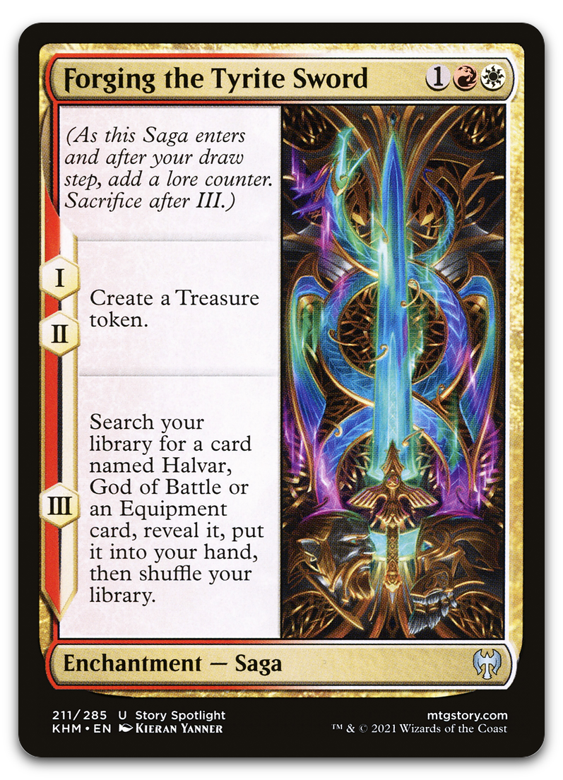 | Card Text | (As this Saga enters and after your draw step, add a lore counter. Sacrifice after III.) I, II — Create a Treasure token. III — Search your library for a card named Halvar, God of Battle or an Equipment card, reveal it, put it into your hand, then shuffle. |