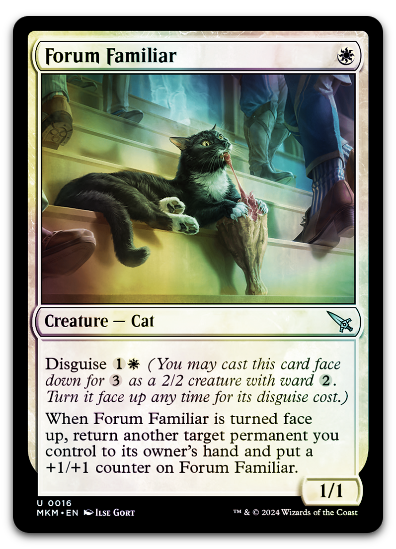 | Card Text | Disguise {1}{W} (You may cast this card face down for {3} as a 2/2 creature with ward {2}. Turn it face up any time for its disguise cost.) When this creature is turned face up, return another target permanent you control to its owner's hand and put a +1/+1 counter on this creature. |