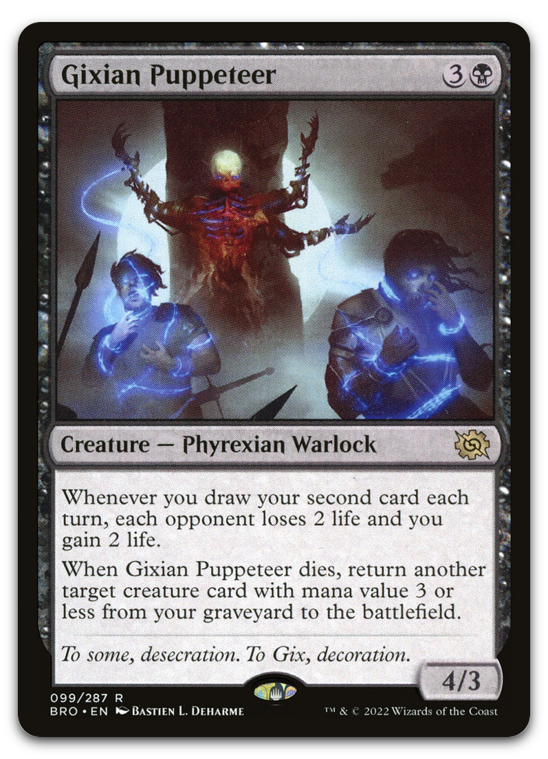| Card Text | Whenever you draw your second card each turn, each opponent loses 2 life and you gain 2 life. When this creature dies, return another target creature card with mana value 3 or less from your graveyard to the battlefield. |