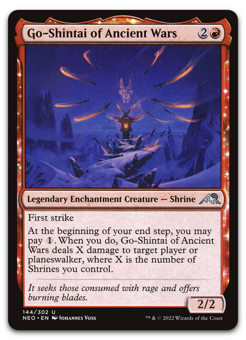 | Card Text | First strike At the beginning of your end step, you may pay {1}. When you do, Go-Shintai of Ancient Wars deals X damage to target player or planeswalker, where X is the number of Shrines you control. |
