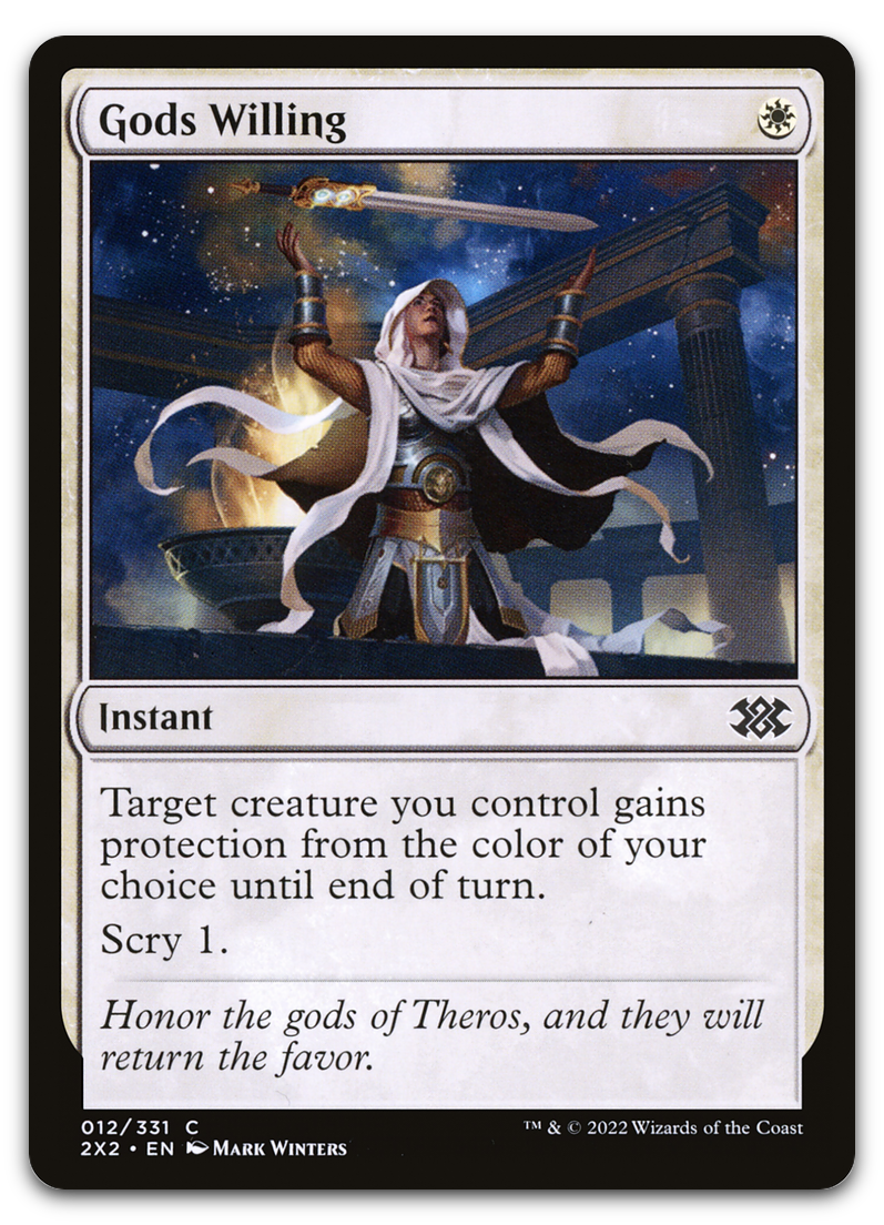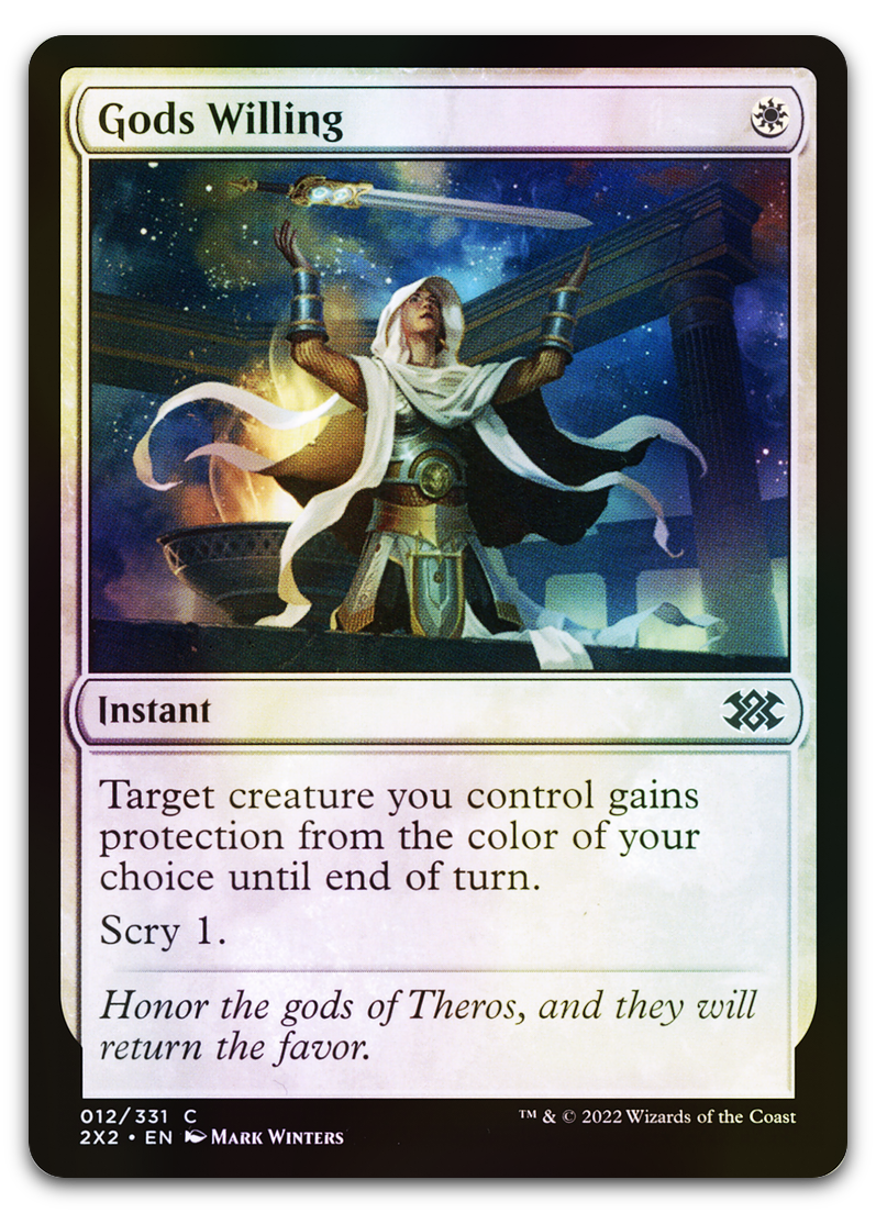 | Card Text | Target creature you control gains protection from the color of your choice until end of turn. (It can't be blocked, targeted, dealt damage, enchanted, or equipped by anything of that color.) Scry 1. |