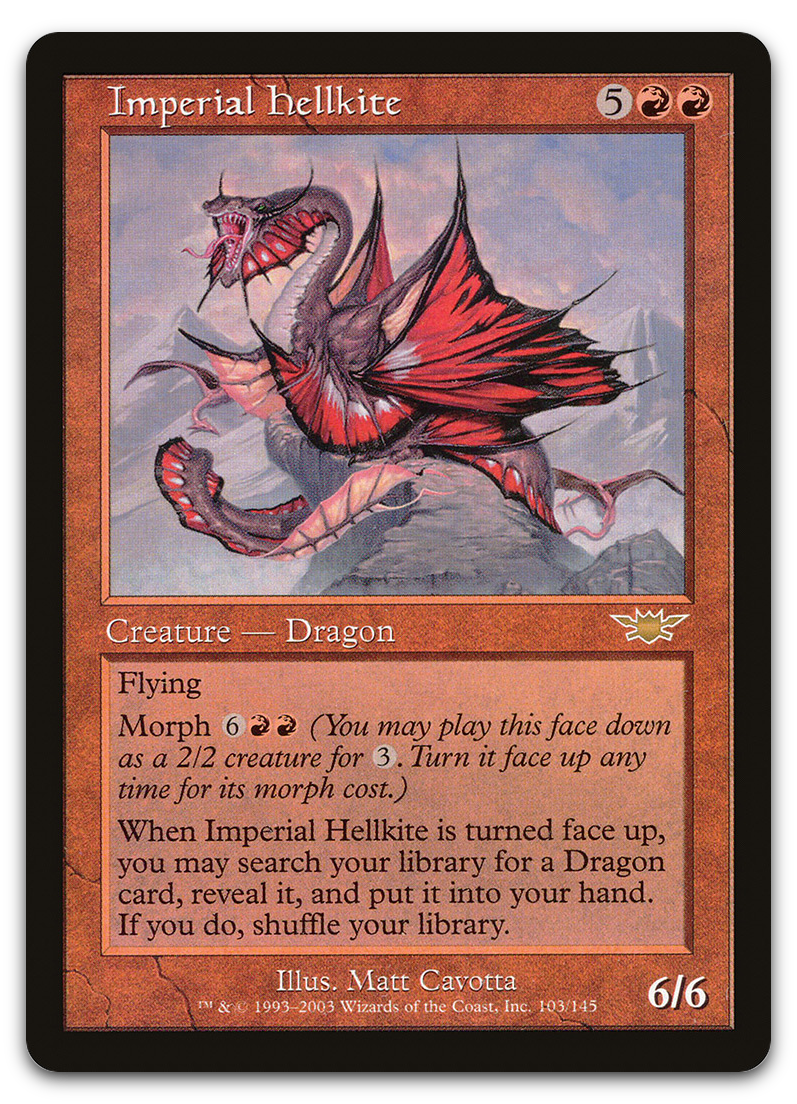| Card Text | Flying Morph {6}{R}{R} (You may cast this card face down as a 2/2 creature for {3}. Turn it face up any time for its morph cost.) When this creature is turned face up, you may search your library for a Dragon card, reveal it, put it into your hand, then shuffle. |