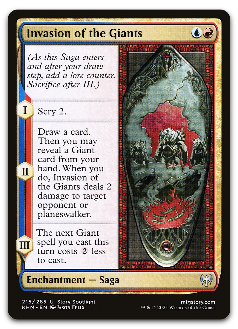 | Card Text | (As this Saga enters and after your draw step, add a lore counter. Sacrifice after III.) I — Scry 2. II — Draw a card. Then you may reveal a Giant card from your hand. When you do, this Saga deals 2 damage to target opponent or planeswalker. III — The next Giant spell you cast this turn costs {2} less to cast. |