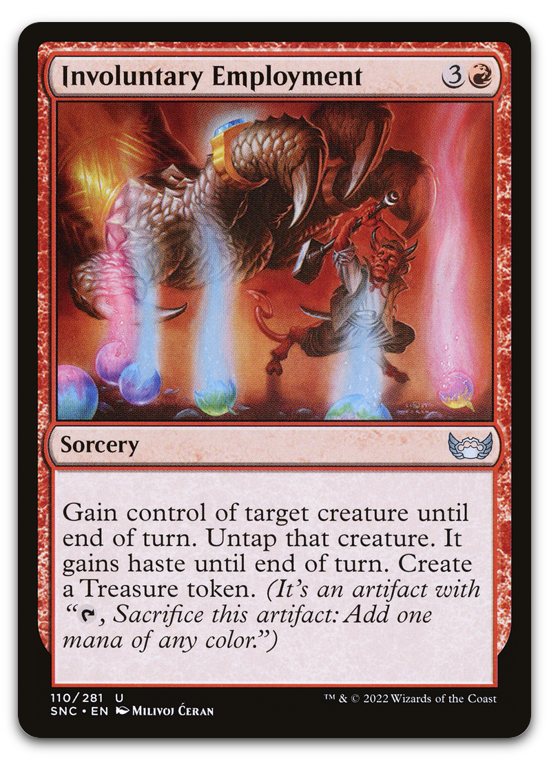 | Card Text | Gain control of target creature until end of turn. Untap that creature. It gains haste until end of turn. Create a Treasure token. (It's an artifact with "{T}, Sacrifice this token: Add one mana of any color.") |