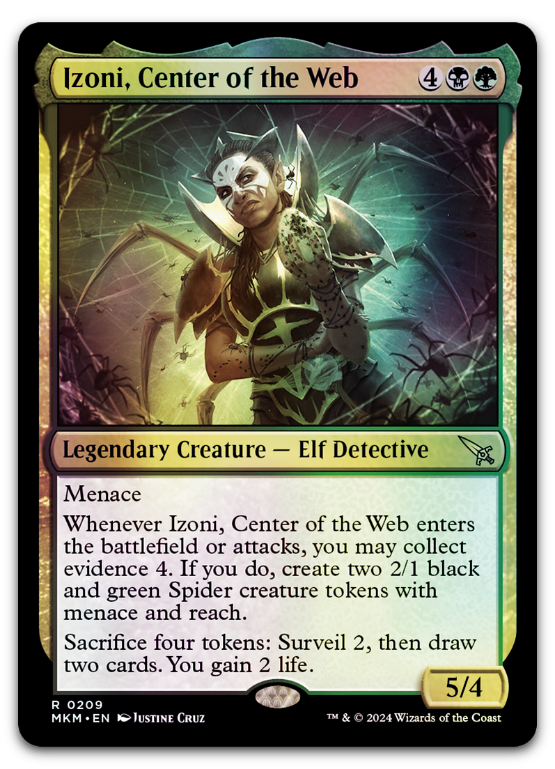 | Card Text | Menace Whenever Izoni enters or attacks, you may collect evidence 4. If you do, create two 2/1 black and green Spider creature tokens with menace and reach. Sacrifice four tokens: Surveil 2, then draw two cards. You gain 2 life. |