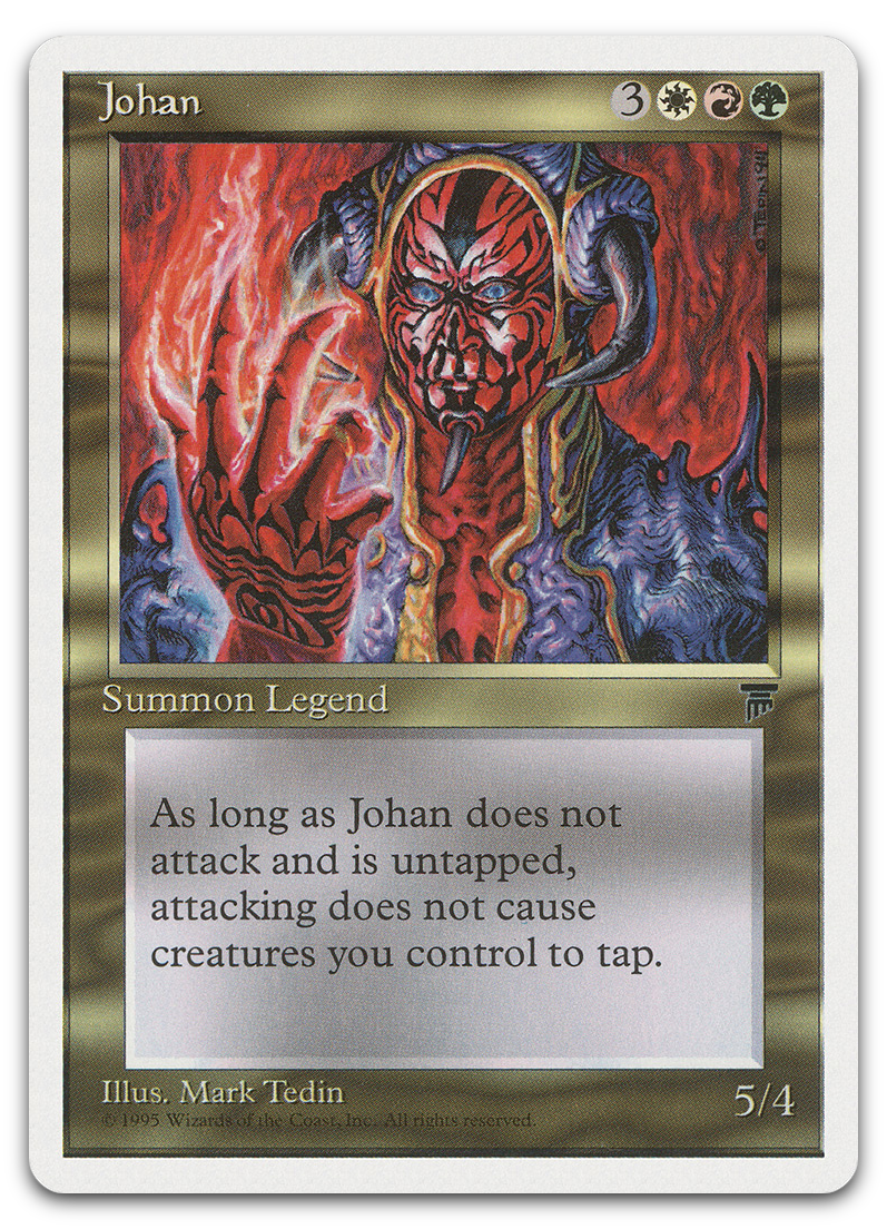 | Card Text | At the beginning of combat on your turn, you may have Johan gain "Johan can't attack" until end of combat. If you do, attacking doesn't cause creatures you control to tap this combat if Johan is untapped. |