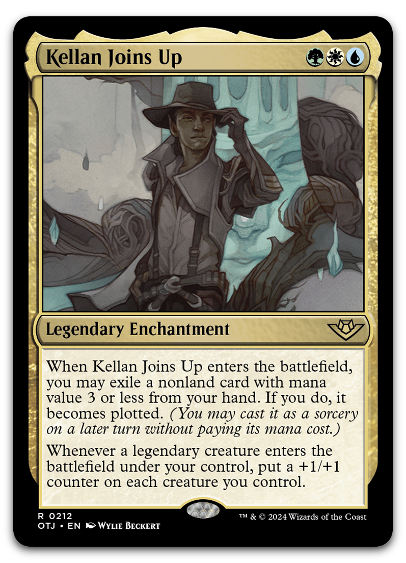 | Card Text | When Kellan Joins Up enters, you may exile a nonland card with mana value 3 or less from your hand. If you do, it becomes plotted. (You may cast it as a sorcery on a later turn without paying its mana cost.) Whenever a legendary creature you control enters, put a +1/+1 counter on each creature you control. |