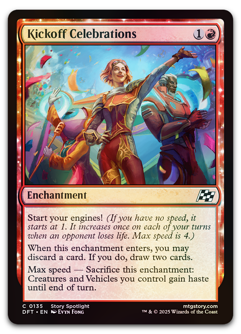 | Card Text | Start your engines! (If you have no speed, it starts at 1. It increases once on each of your turns when an opponent loses life. Max speed is 4.) When this enchantment enters, you may discard a card. If you do, draw two cards. Max speed — Sacrifice this enchantment: Creatures and Vehicles you control gain haste until end of turn. |
