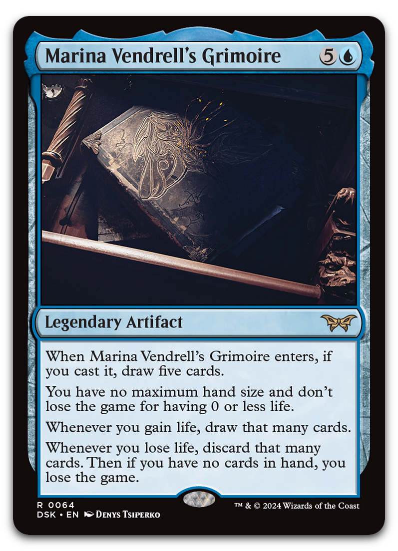 | Card Text | When Marina Vendrell's Grimoire enters, if you cast it, draw five cards. You have no maximum hand size and don't lose the game for having 0 or less life. Whenever you gain life, draw that many cards. Whenever you lose life, discard that many cards. Then if you have no cards in hand, you lose the game. |