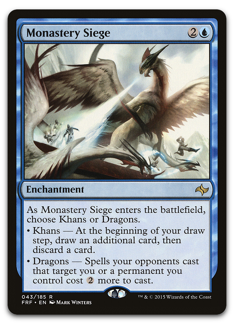 | Card Text | As this enchantment enters, choose Khans or Dragons. • Khans — At the beginning of your draw step, draw an additional card, then discard a card. • Dragons — Spells your opponents cast that target you or a permanent you control cost {2} more to cast. |