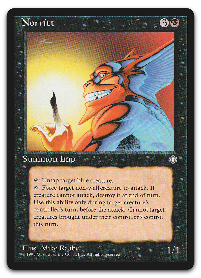 | Card Text | {T}: Untap target blue creature. {T}: Choose target non-Wall creature the active player has controlled continuously since the beginning of the turn. That creature attacks this turn if able. Destroy it at the beginning of the next end step if it didn't attack this turn. Activate only before attackers are declared. |