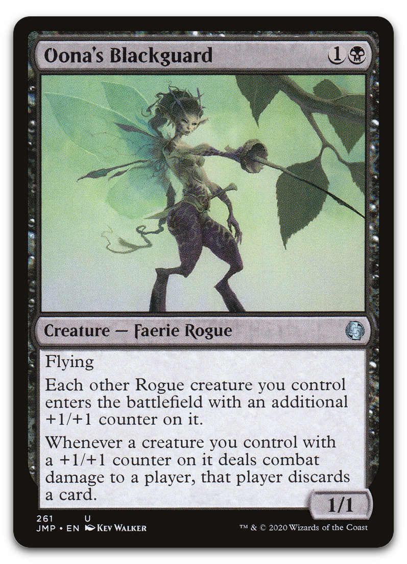 | Card Text | Flying Each other Rogue creature you control enters with an additional +1/+1 counter on it. Whenever a creature you control with a +1/+1 counter on it deals combat damage to a player, that player discards a card. |