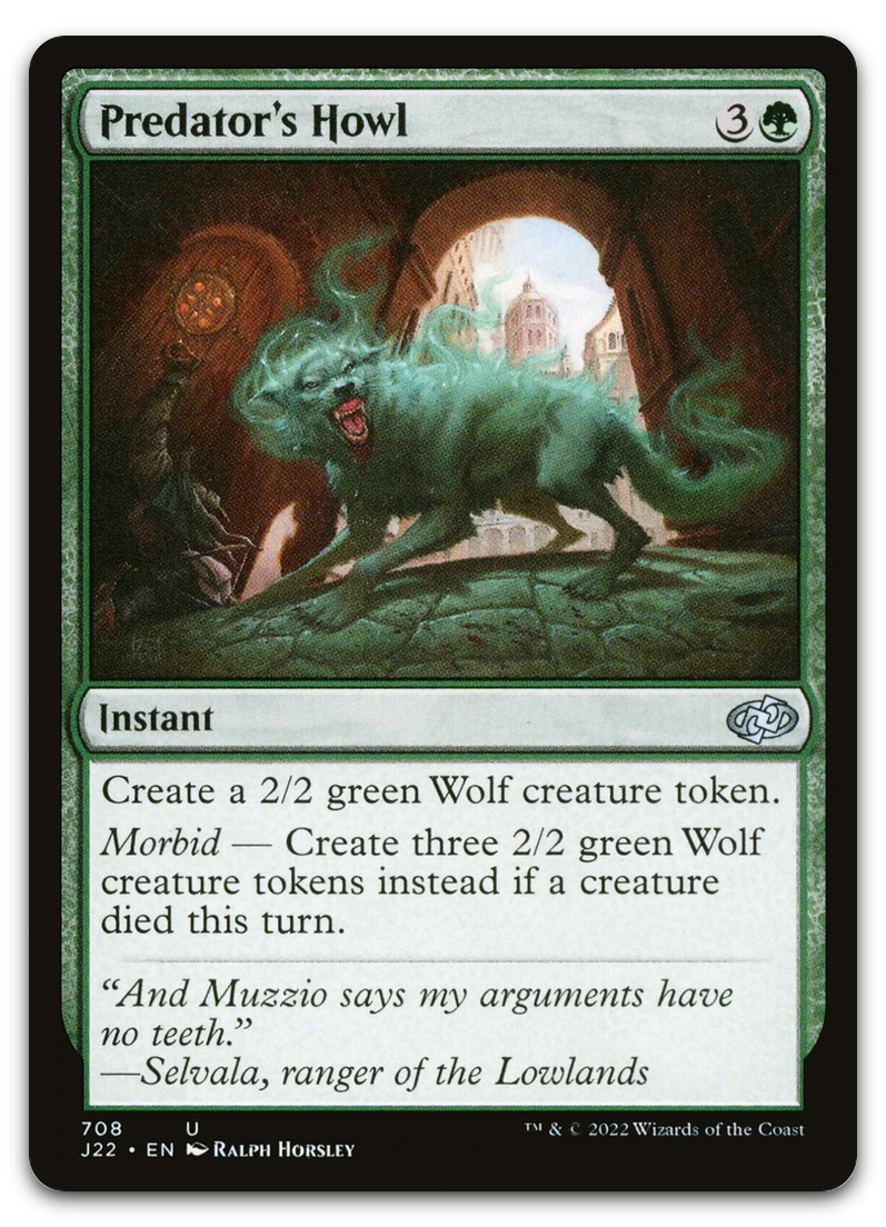 | Card Text | Create a 2/2 green Wolf creature token. Morbid — Create three 2/2 green Wolf creature tokens instead if a creature died this turn. |