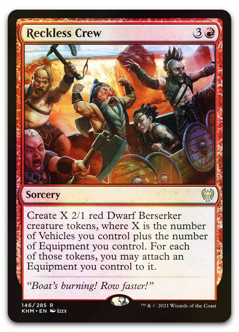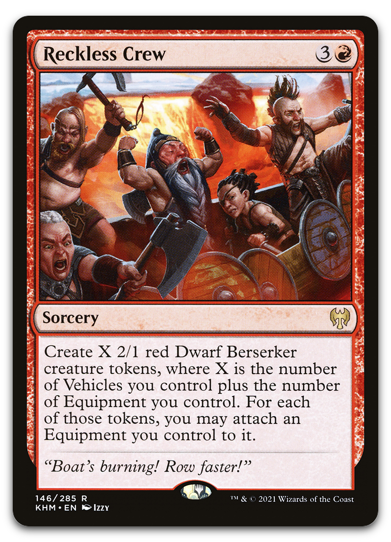 | Card Text | Create X 2/1 red Dwarf Berserker creature tokens, where X is the number of Vehicles you control plus the number of Equipment you control. For each of those tokens, you may attach an Equipment you control to it. |