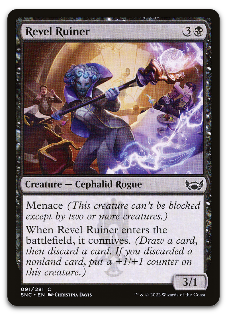 | Card Text | Menace (This creature can't be blocked except by two or more creatures.) When this creature enters, it connives. (Draw a card, then discard a card. If you discarded a nonland card, put a +1/+1 counter on this creature.) |