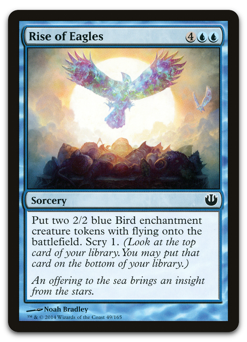 | Card Text | Create two 2/2 blue Bird enchantment creature tokens with flying. Scry 1. (Look at the top card of your library. You may put that card on the bottom.) |