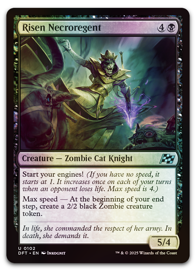 | Card Text | Start your engines! (If you have no speed, it starts at 1. It increases once on each of your turns when an opponent loses life. Max speed is 4.) Max speed — At the beginning of your end step, create a 2/2 black Zombie creature token. |