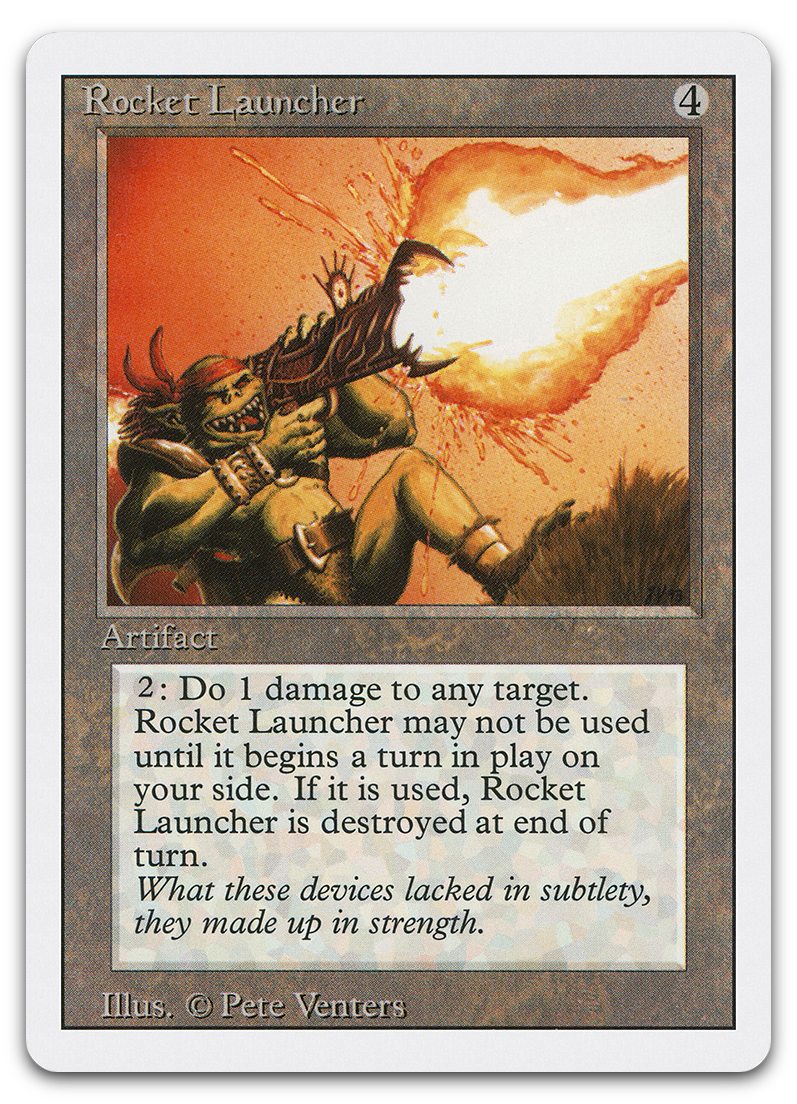 | Card Text | {2}: Rocket Launcher deals 1 damage to any target. Destroy Rocket Launcher at the beginning of the next end step. Activate only if you've controlled Rocket Launcher continuously since the beginning of your most recent turn. |