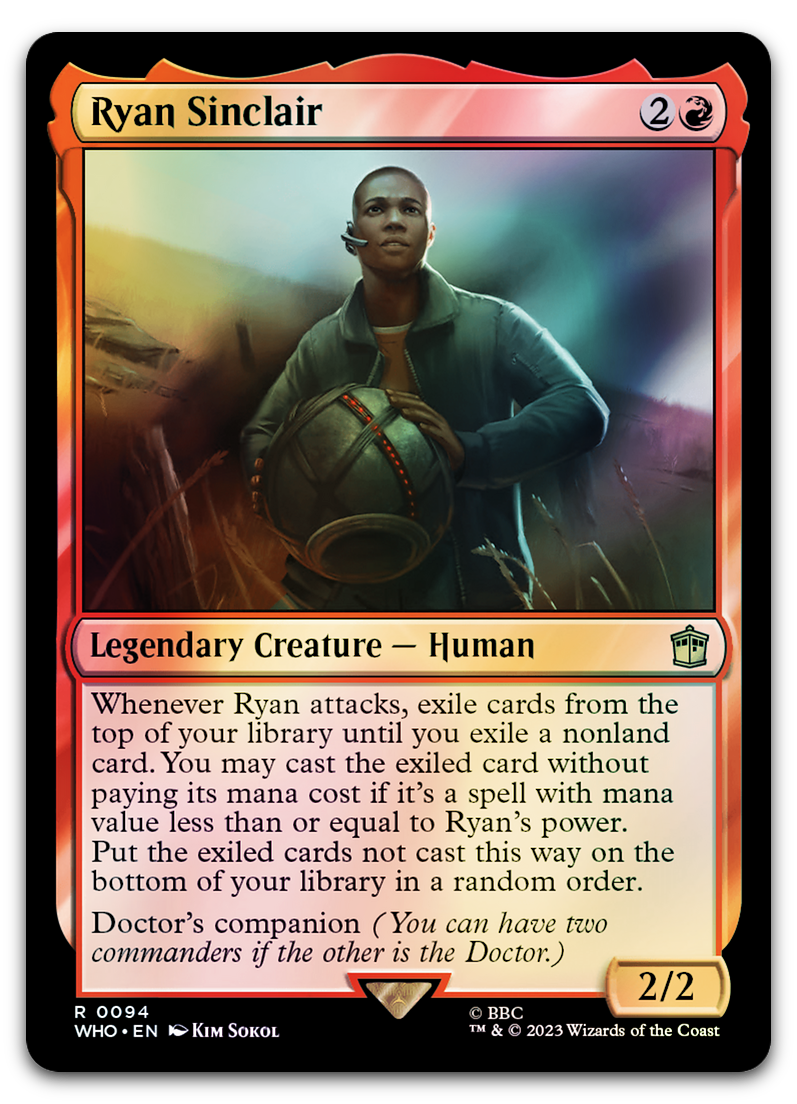 | Card Text | Whenever Ryan attacks, exile cards from the top of your library until you exile a nonland card. You may cast the exiled card without paying its mana cost if it's a spell with mana value less than or equal to Ryan's power. Put the exiled cards not cast this way on the bottom of your library in a random order. Doctor's companion (You can have two commanders if the other is the Doctor.) |
