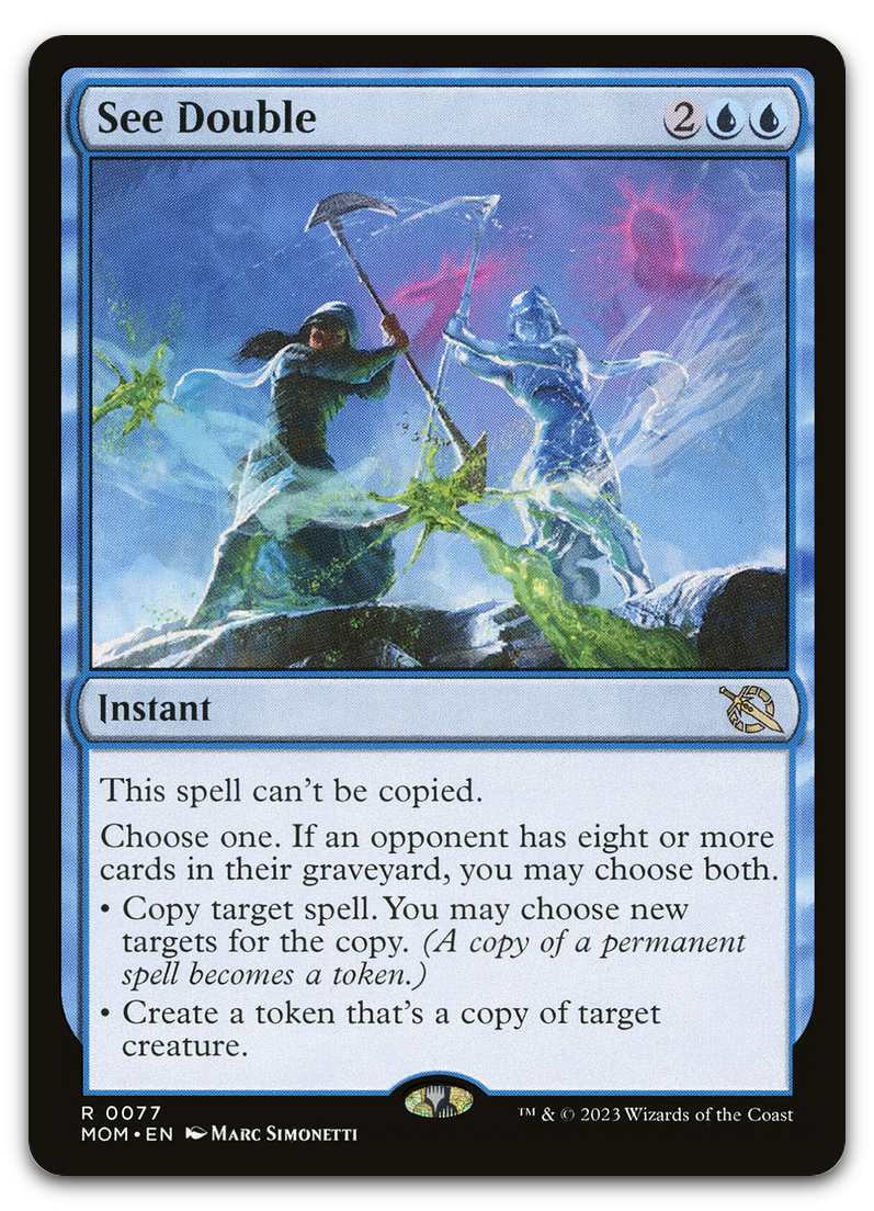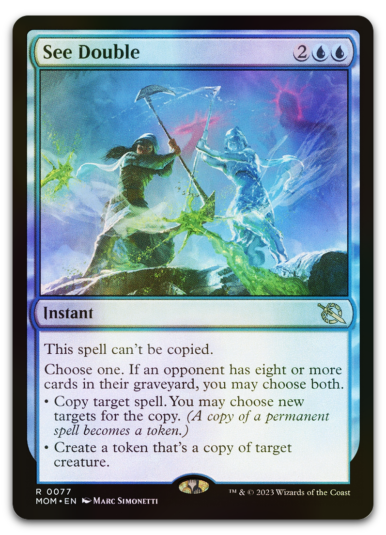 | Card Text | This spell can't be copied. Choose one. If an opponent has eight or more cards in their graveyard, you may choose both instead. • Copy target spell. You may choose new targets for the copy. (A copy of a permanent spell becomes a token.) • Create a token that's a copy of target creature. |