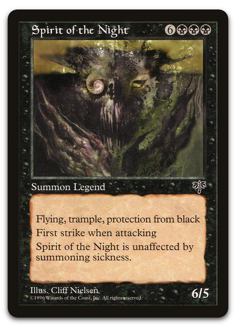 | Card Text | Flying, trample, haste, protection from black Spirit of the Night has first strike as long as it's attacking. |