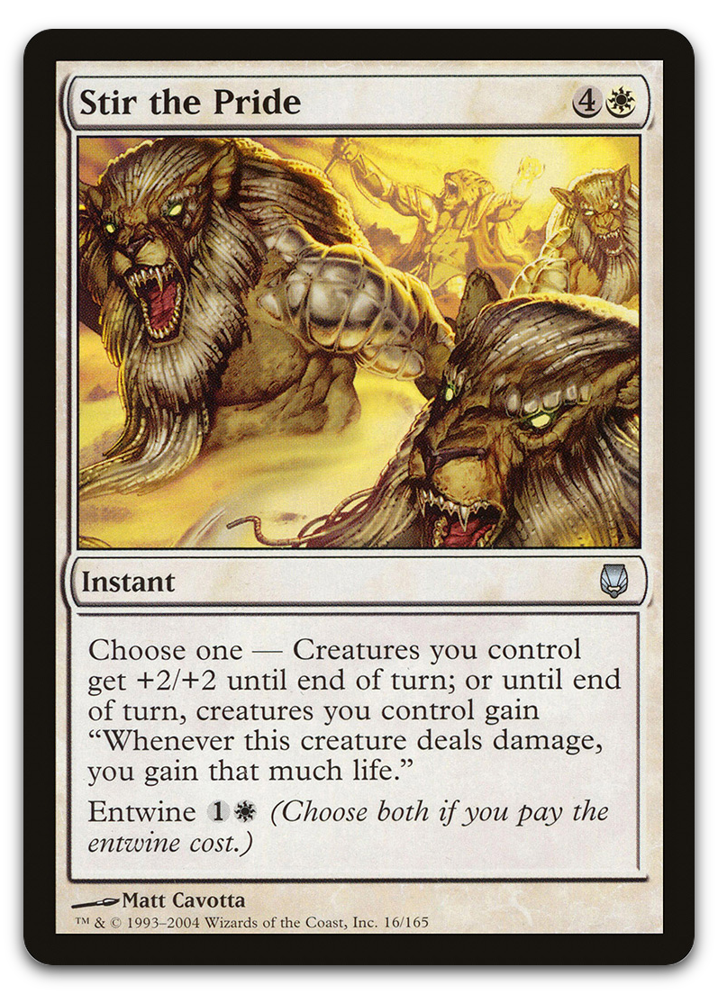 | Card Text | Choose one — • Creatures you control get +2/+2 until end of turn. • Until end of turn, creatures you control gain "Whenever this creature deals damage, you gain that much life." Entwine {1}{W} (Choose both if you pay the entwine cost.) |