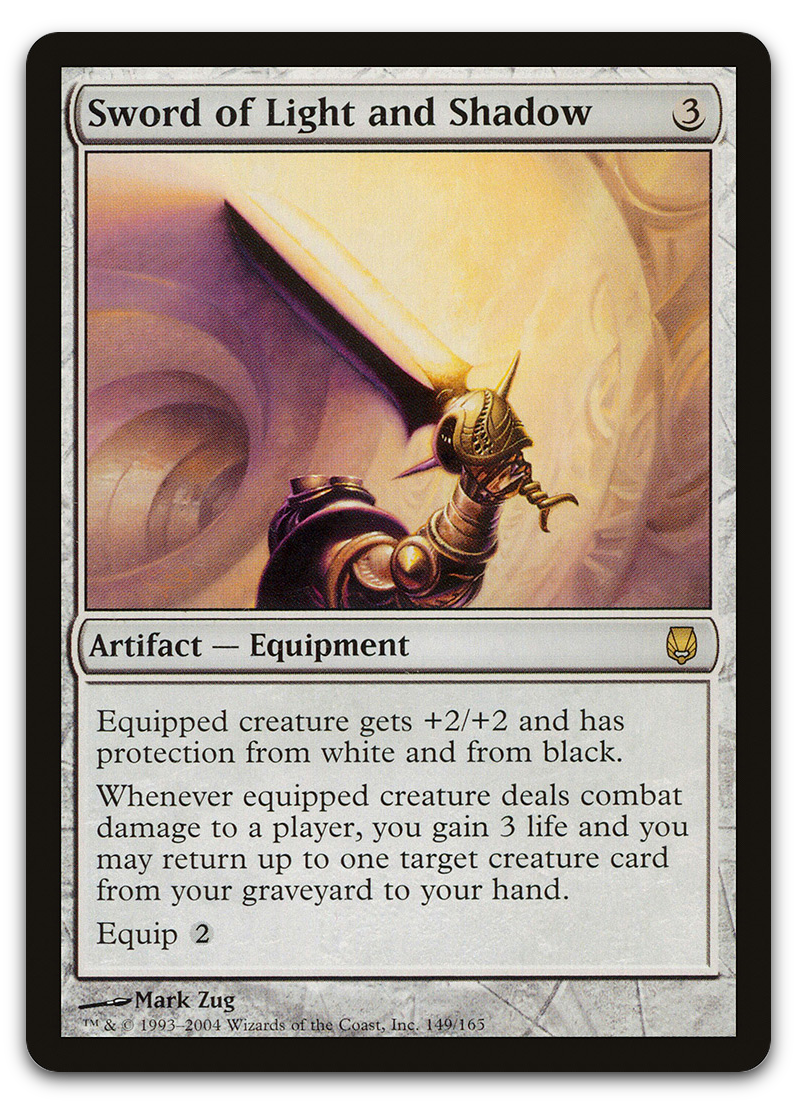 | Card Text | Equipped creature gets +2/+2 and has protection from white and from black. Whenever equipped creature deals combat damage to a player, you gain 3 life and you may return up to one target creature card from your graveyard to your hand. Equip {2} |