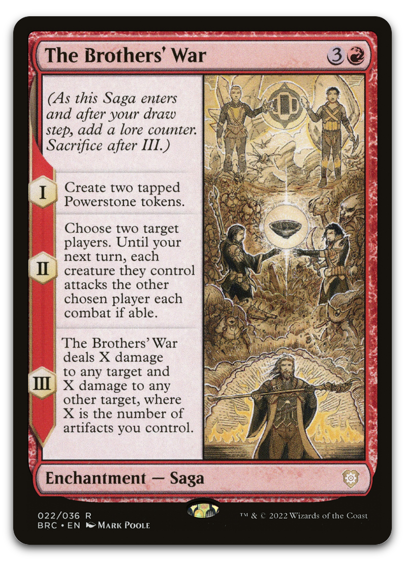 | Card Text | (As this Saga enters and after your draw step, add a lore counter. Sacrifice after III.) I — Create two tapped Powerstone tokens. II — Choose two target players. Until your next turn, each creature they control attacks the other chosen player each combat if able. III — This Saga deals X damage to any target and X damage to any other target, where X is the number of artifacts you control. |