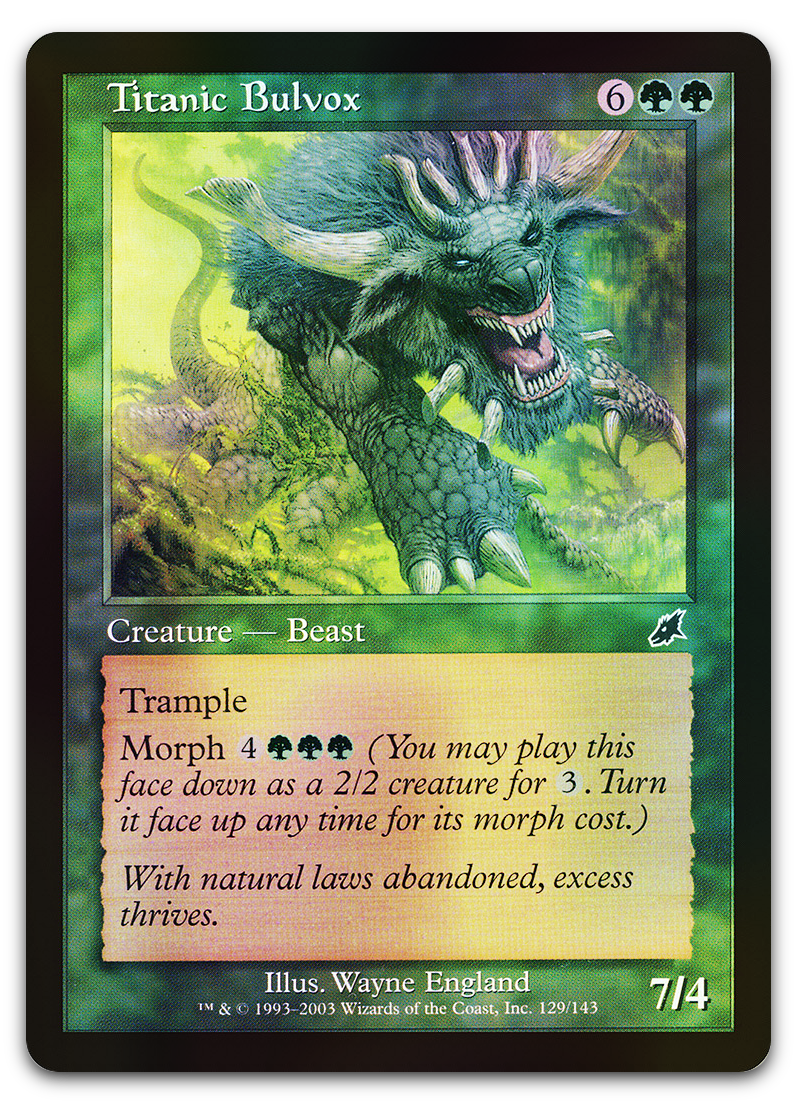 | Card Text | Trample Morph {4}{G}{G}{G} (You may cast this card face down as a 2/2 creature for {3}. Turn it face up any time for its morph cost.) |