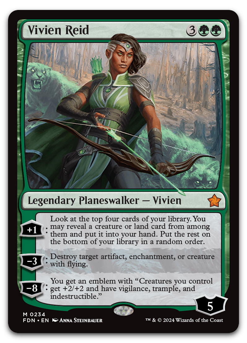 | Card Text | +1: Look at the top four cards of your library. You may reveal a creature or land card from among them and put it into your hand. Put the rest on the bottom of your library in a random order. −3: Destroy target artifact, enchantment, or creature with flying. −8: You get an emblem with "Creatures you control get +2/+2 and have vigilance, trample, and indestructible." |
