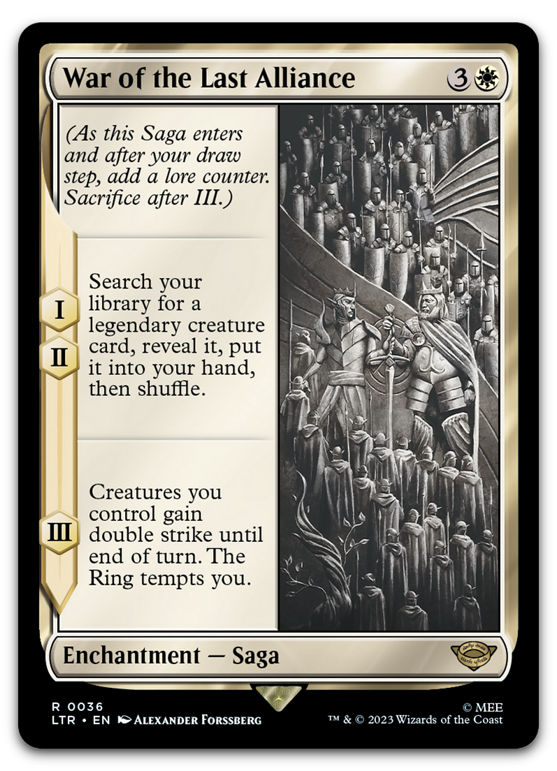 | Card Text | (As this Saga enters and after your draw step, add a lore counter. Sacrifice after III.) I, II — Search your library for a legendary creature card, reveal it, put it into your hand, then shuffle. III — Creatures you control gain double strike until end of turn. The Ring tempts you. |