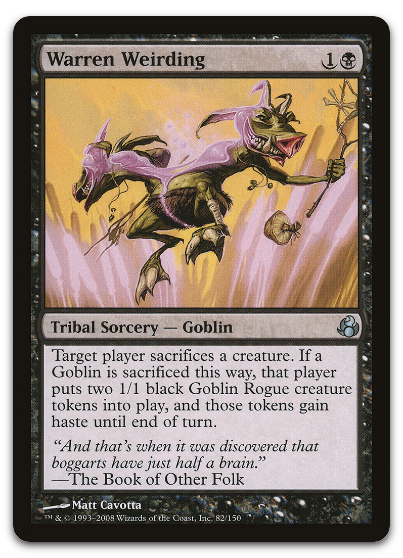 | Card Text | Target player sacrifices a creature of their choice. If a Goblin is sacrificed this way, that player creates two 1/1 black Goblin Rogue creature tokens, and those tokens gain haste until end of turn. |