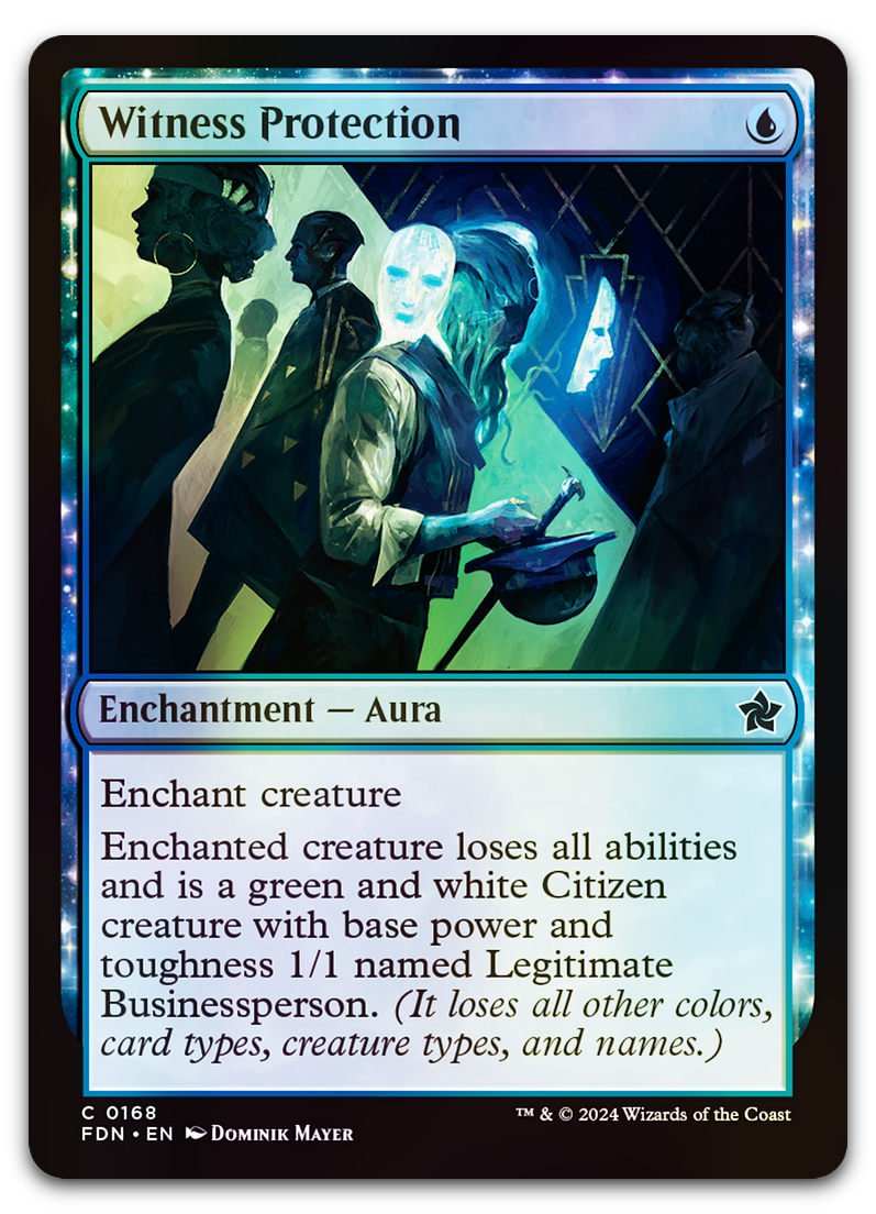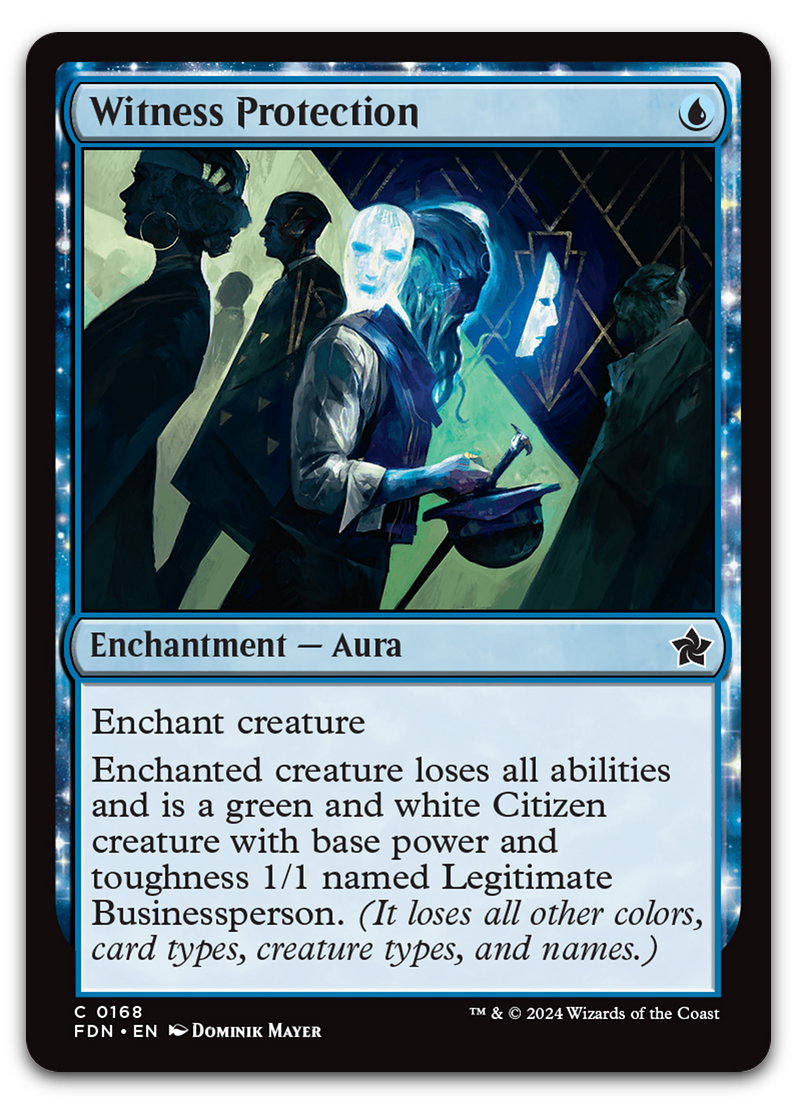 | Card Text | Enchant creature Enchanted creature loses all abilities and is a green and white Citizen creature with base power and toughness 1/1 named Legitimate Businessperson. (It loses all other colors, card types, creature types, and names.) |
